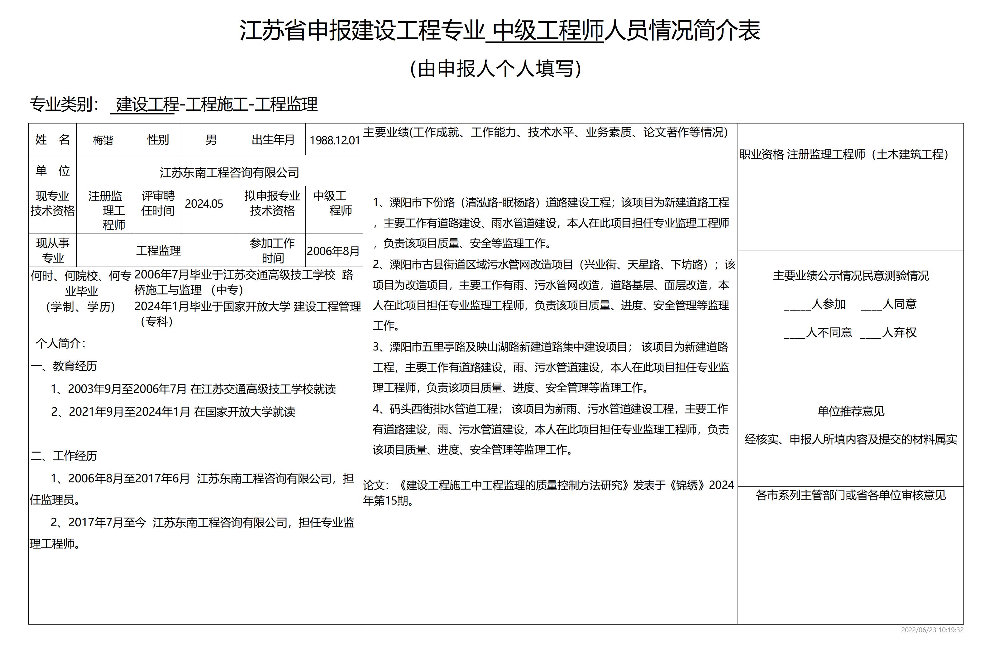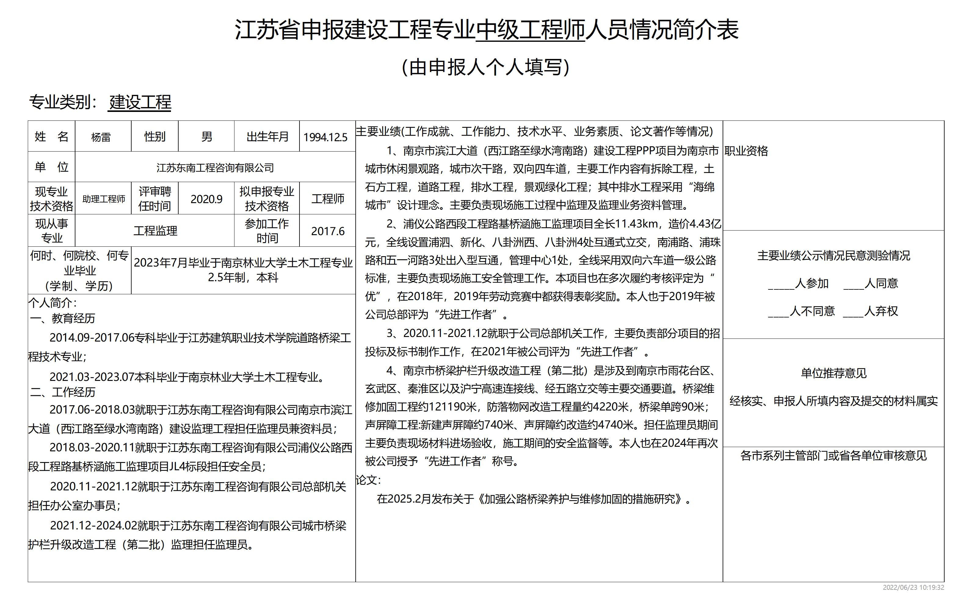 根據(jù)《江蘇省建設(shè)工程專業(yè)技術(shù)資格條件(試行)》規(guī)定,2025年度有楊雷等5名同志擬申報(bào)江蘇省住房和城鄉(xiāng)建設(shè)廳建設(shè)工程專業(yè)中級(jí)工程師。為體現(xiàn)公開(kāi)、公平、公正原則,廣泛聽(tīng)取群眾意見(jiàn),現(xiàn)將擬申報(bào)人員信息予以公示。